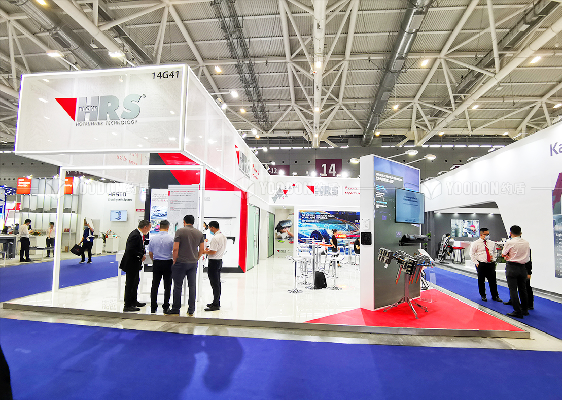 圣萬提注塑工業是世界一流的熱流道系統和熱流道相關部件制造商之一,致力于提供高品質產品及超值的售前、售后服務。展臺風格偏向于工業化、國際化,在簡約的配色上由頂部結構的造型做主導作用。