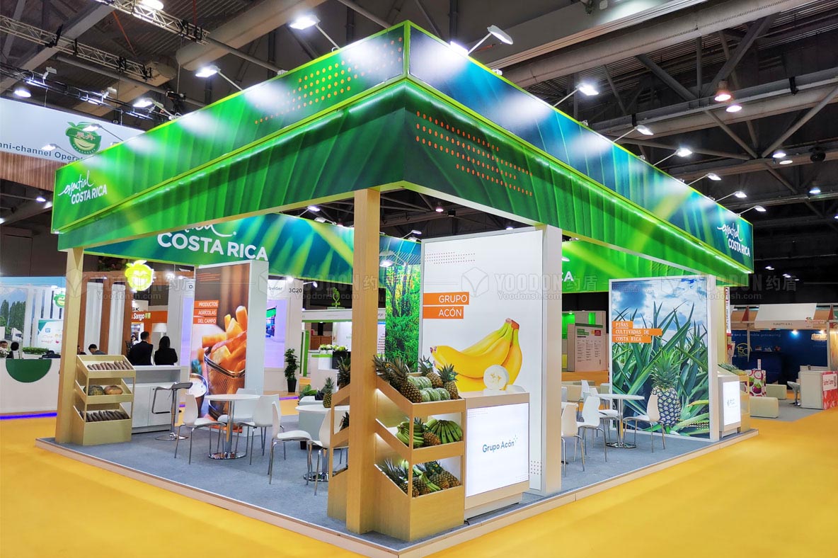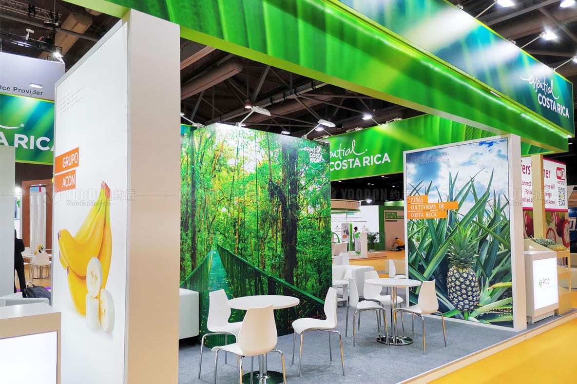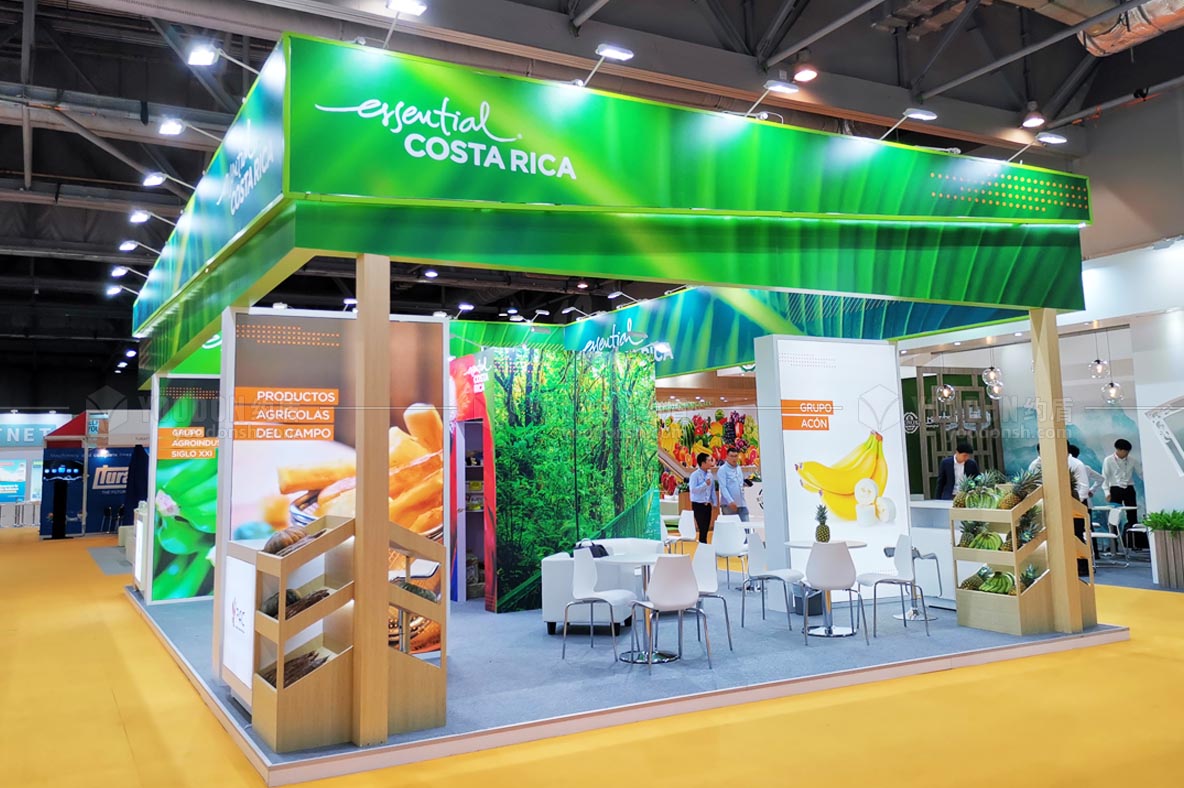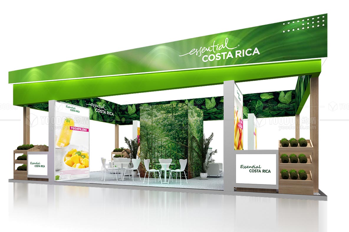 哥斯達(dá)黎加是拉丁美洲的一個農(nóng)業(yè)國家,農(nóng)業(yè)發(fā)達(dá),而且屬于熱帶和亞熱帶氣候,環(huán)境優(yōu)美、綠植覆蓋率高,國名教育素質(zhì)高,所以旅游業(yè)蓬勃發(fā)展,同時由于是中美洲和南美洲的文化交匯處而擁有多樣的文化,哥斯達(dá)黎加咖啡在全球聞名。出于這一基本國情的考量,約盾的設(shè)計力圖突出其自然風(fēng)光優(yōu)勢,采用大面積LED屏展示動態(tài)畫面來展示哥斯達(dá)黎加美麗的自然風(fēng)光和人文風(fēng)景。設(shè)計主色調(diào)是綠色和體現(xiàn)原生態(tài)的木色,設(shè)計主題是自然、綠色、環(huán)保。設(shè)計師通過大面積地使用具有熱帶風(fēng)情的大綠葉做海報造型,并以此來體現(xiàn)哥斯達(dá)黎加的自然風(fēng)貌,非常吸引人,獲得了哥斯達(dá)黎加參展商和到場觀眾的一致好評。考慮到咖啡品嘗問題,搭建時為展商準(zhǔn)備了咖啡機,可以讓展商在現(xiàn)場沖泡咖啡,有利于開發(fā)潛在客戶,有效地達(dá)到展示產(chǎn)品的目的,實現(xiàn)產(chǎn)品外銷的愿望。