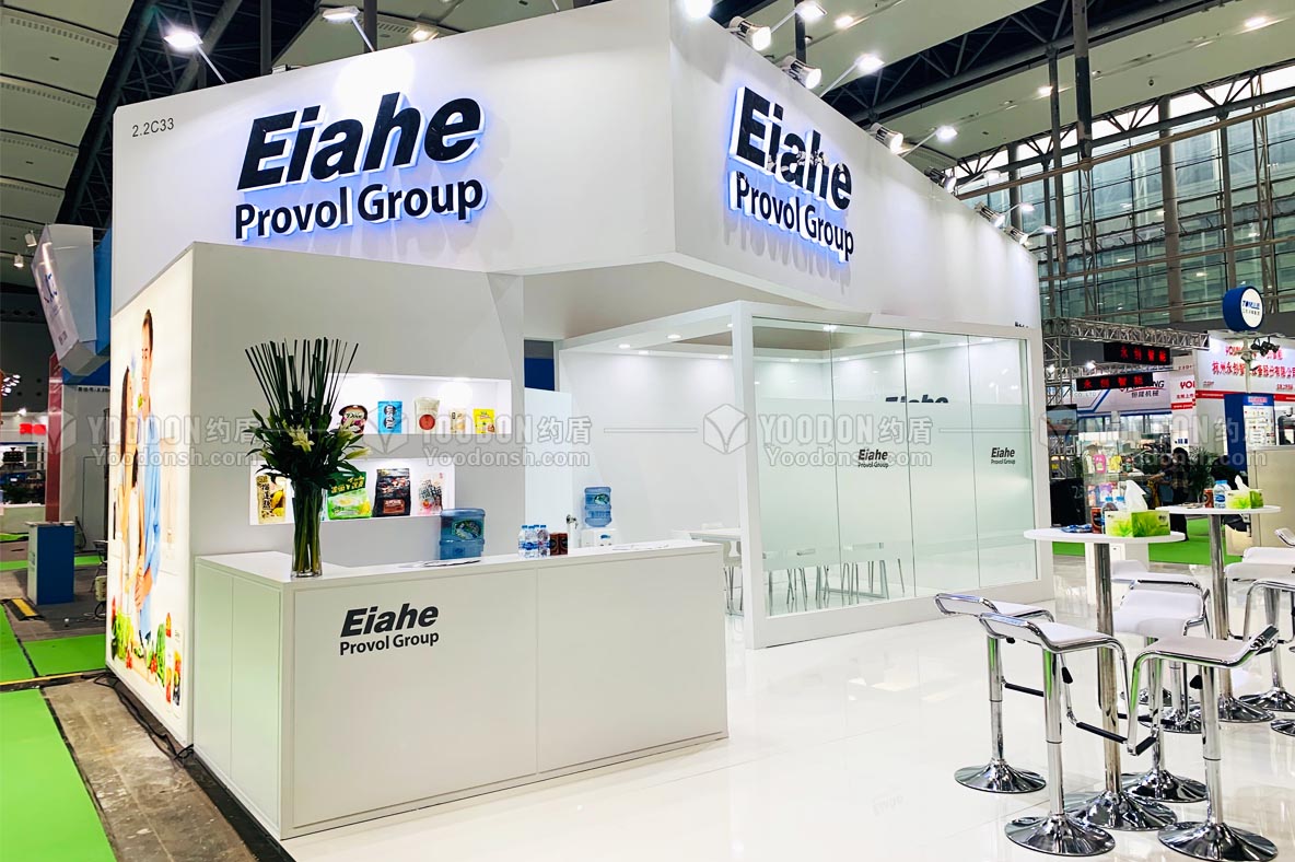 展臺整體設計風格偏向于簡約國際化,主色調為白色,展臺設計著重突出產品的展示。展位布局分為儲藏區、VIP會議室、洽談區和產品展示區。產品展示區靠近展臺主通道,視覺通透,沒有遮擋,觀眾從主通道走過來可以一眼看到展示的產品,可以有效地提高產品的曝光率。VIP會議室為重點客戶提供比較私密的談話空間,提供舒適的參觀約談環境。展臺中央位置沒有設置功能區,比較空曠,所以設為開放式的洽談區,有利于觀眾自由穿梭和參觀、拜訪。與設置在通道旁的洽談區相比,這種功能區安排可以創造相對安靜的會談環境,免受人流干擾。為了突出企業形象,設計師在設計門頭時將企業名稱用巨大的發光字進行顯示。