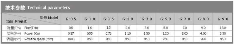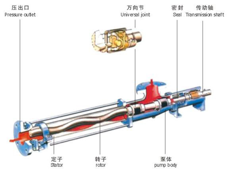 單螺桿泵是按迥轉嚙合容積式原理工作的新型泵種,主要工作部件是偏心螺桿(轉子) 和固定的襯套(定子)。由于該二部件的特殊幾何形狀,分別形成單獨的密封容腔,介質由軸向均勻推行流動,內部流速低,容積保持不變,壓力穩定,因而不會產生渦流和攪動。每級泵的輸出壓力為0.6MPa,揚程60m(清水),自吸高度一般在6m以上。因定子選用多種彈性材料制成,所以這種泵適合輸送高粘度流體,也可以輸送含有硬質懸浮顆粒或含有纖維介質的物料,有一般泵類不能勝任的特性。其流量與轉速成正比,可通過調節轉速對流量進行調整。