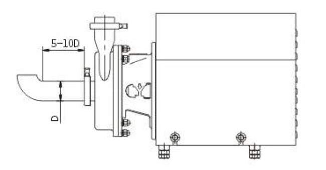 泵在小流量運行時,效率很低,消耗的能量使液體溫度急劇上升,泵在小流量下運行,通過葉輪間隙回流增加,造成泵壓力脈動、振動、 噪音等危害增加,因而,連接的管道進口直徑最好不要小于設計進口直徑。為了保證泵運行的更加穩定、泵進口前需要連接一段直管,長度約為5- 10倍管道直徑